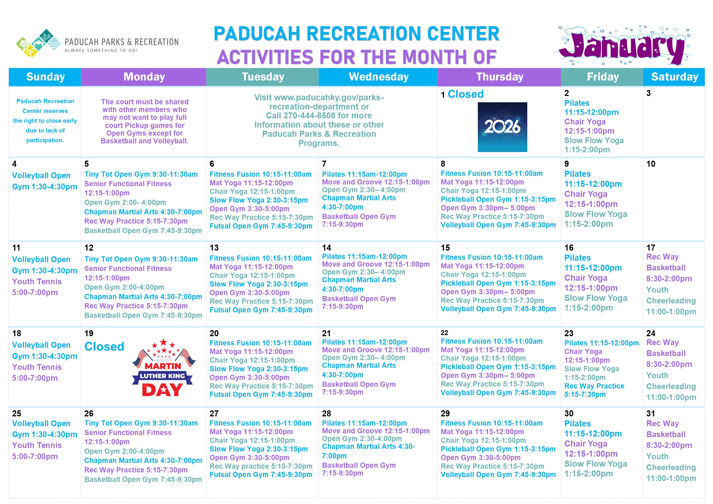 The Paducah Recreation Center is available for reservations for birthday parties and athletic/fitness activities only.